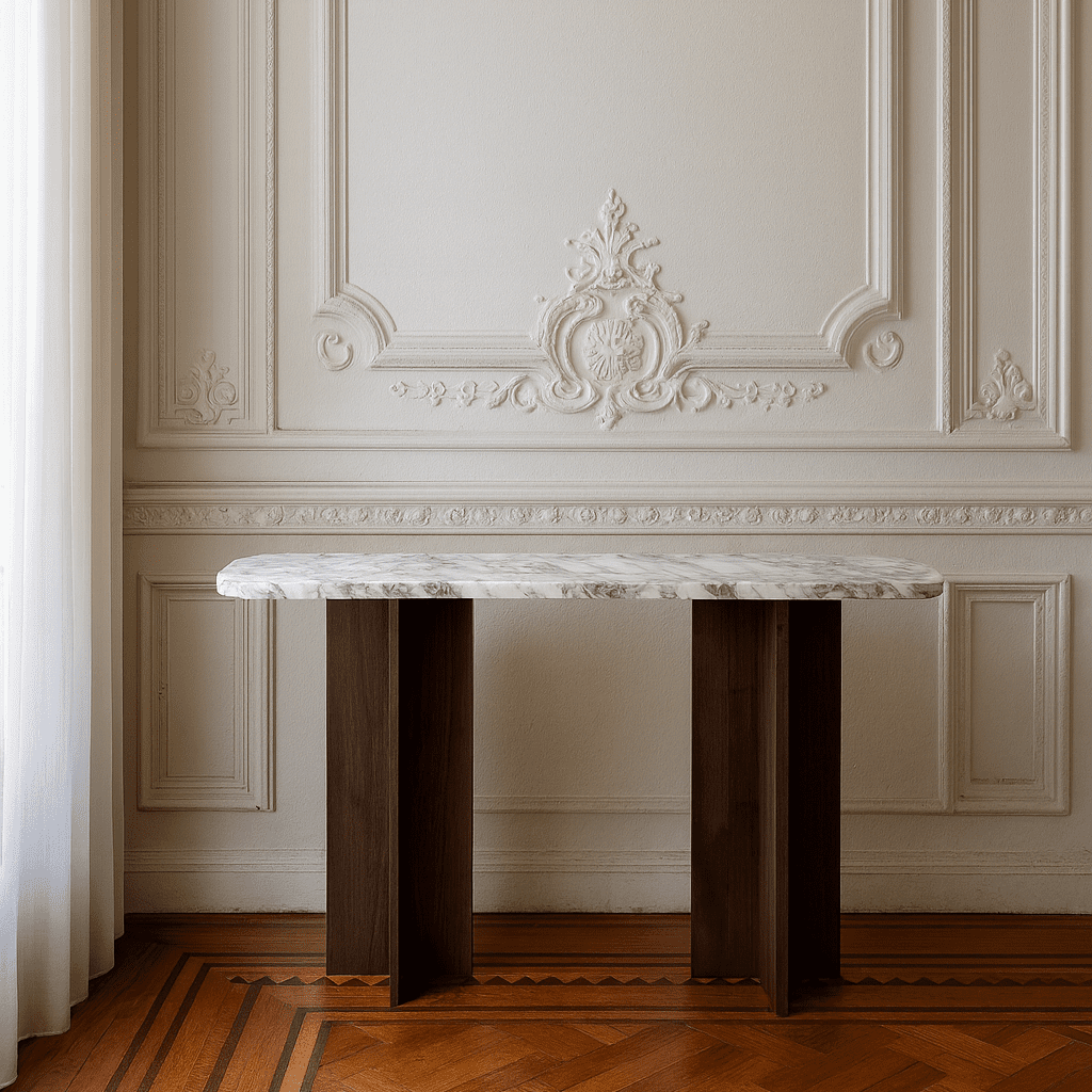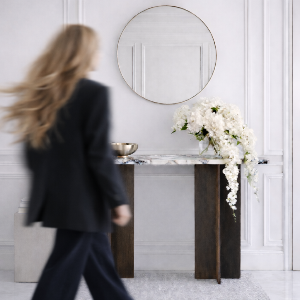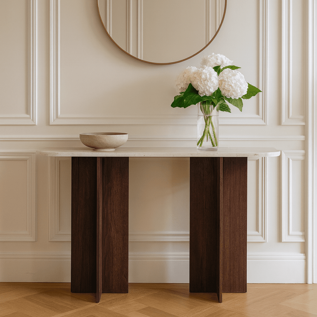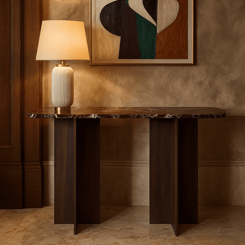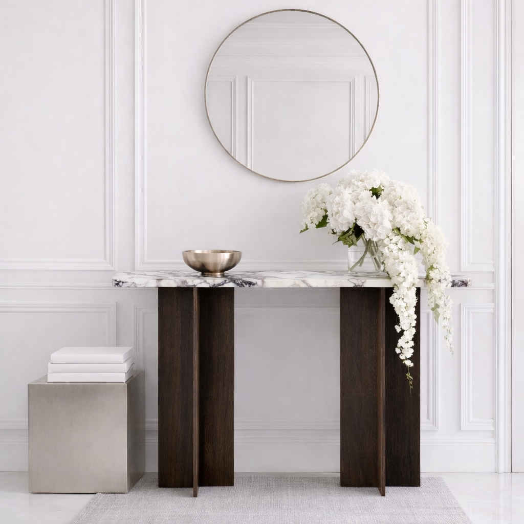 Our new Treasure Console Table Collection combines natural smoked wood and elegant real stone for a stylish, modern touch. Perfect for adding warmth and sophistication to any space. Choose with your favorite table top.